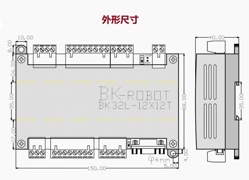 尺寸:150mm x 90mm x 42mm,不含DB9、端子伸出部分和斜角两端的底座固定孔部分